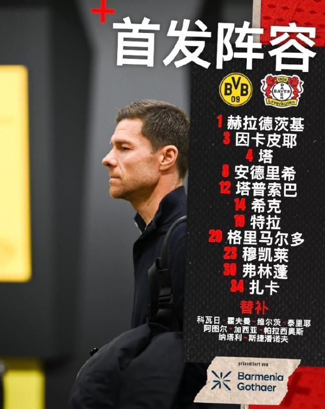 比赛开始不到半分钟,勒沃库森在前场的积极逼抢造成多特后场出球失误,特拉接队友头球摆渡不停球爆射破门,1:0!